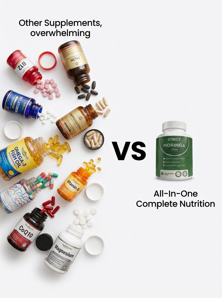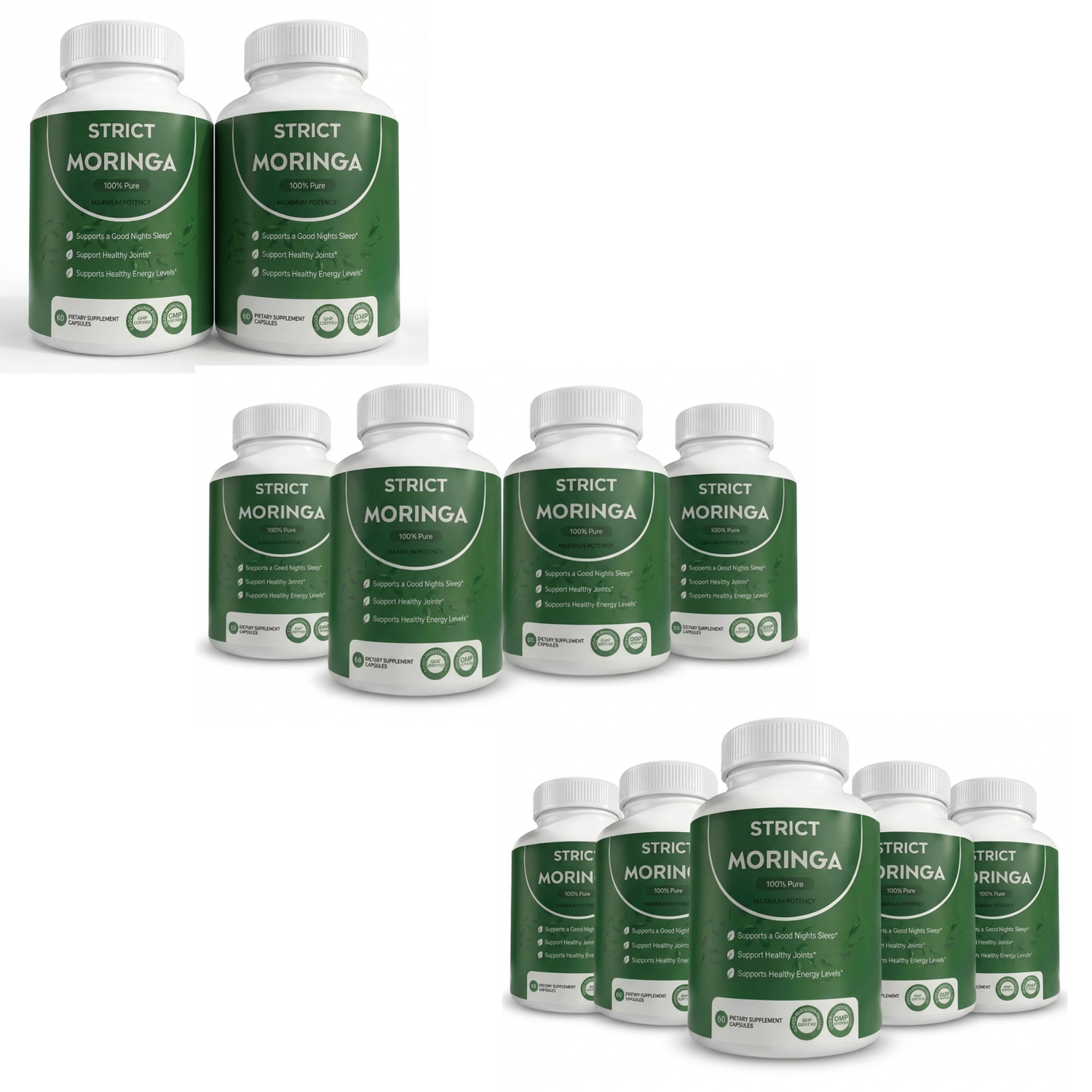 The Strict Moringa capsules revolutionize wellness. Crafted with 92+ bioavailable nutrients, they target the root cause of fatigue and stress, ensuring immediate and sustained vitality. Ideal for daily use or demanding periods, they promise optimal support for your body and mind.